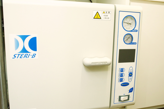 世界でも厳しいとされる、ヨーロッパ規格の最高滅菌基準「クラスB」に準じた、高性能な高圧蒸気滅菌器です。全ての器具の滅菌が可能です。それ以外にも、クラスN滅菌機、タービン自動洗浄注油機、などそろえています。滅菌室はオープンキッチンのようなガラス張りにしておりますので、入室時や退室時に覗いてみてください。