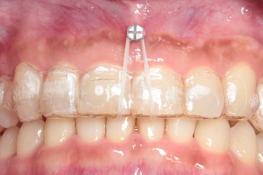 その状態で前歯を押し込んで圧下させます