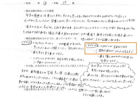 当院では矯正終了後に任意で感想を書いていただいておりますが