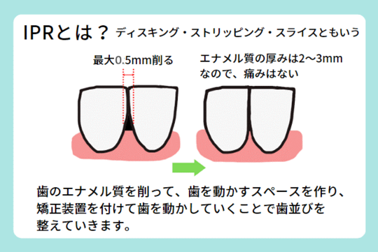 動画のようにIPRとは、薄く歯間を削り、スペースを得る方法です(1か所最大0.5㎜)。きちんと処理をすれば、痛みも害も出ません。むしろ、歯が強化されて虫歯になりにくくなる、という研究データすらあります。