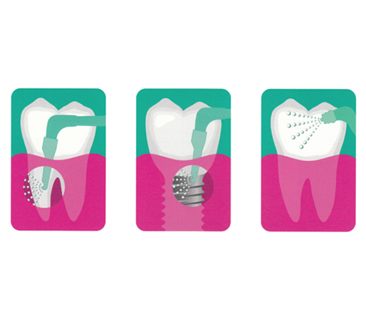 直訳すると、『専門家による機械的な歯面清掃』となります。予防処置専用の機械(当院ではペリオメイト)で行います。ペリオメイトはパウダーメインテナンス(アミノ酸微粒子を歯面に吹き付けて清掃)を行う機械で、歯や歯ぐきを傷つけず効率的にバイオフィルム(歯ブラシでは取れない細菌のかたまり)を除去できる機械です。優しくきれいに清掃した後は『リナメル』で歯のミクロの傷の修復や『高濃度フッ化物』で歯の強化を行います。